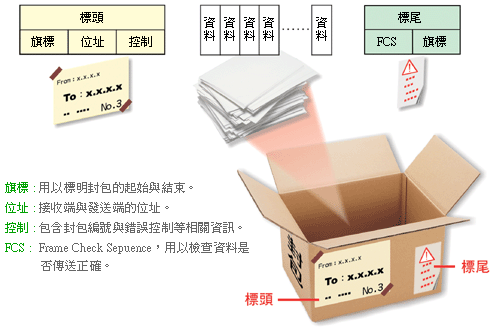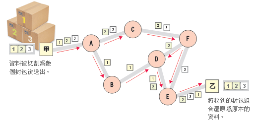 | 為了讓網路上的資料傳送更有效率,欲透過網路傳送的資料會先切割為許多較小的區塊稱之為封包(Packet),每一封包中除資料外還包含用以記載來源、目的地、次序、錯誤控制等資訊的標頭與標尾資料,如圖。 ↑ 封包的架構 這些封包被分別送出並可能經由不同路徑依不同順序抵達目的地,但接收端可根據封包上的資訊將資料重新組合復原,如下圖,此外,由於每一線路皆可傳遞來自不同使用者的封包,如此不但可以提高線路使用率,大幅增加網路整體傳輸速度,而且當某段線路故障時,也可藉由選擇其他路徑而增加封包傳送的可靠性。 ![]() ↑ 封包傳送示意圖 |